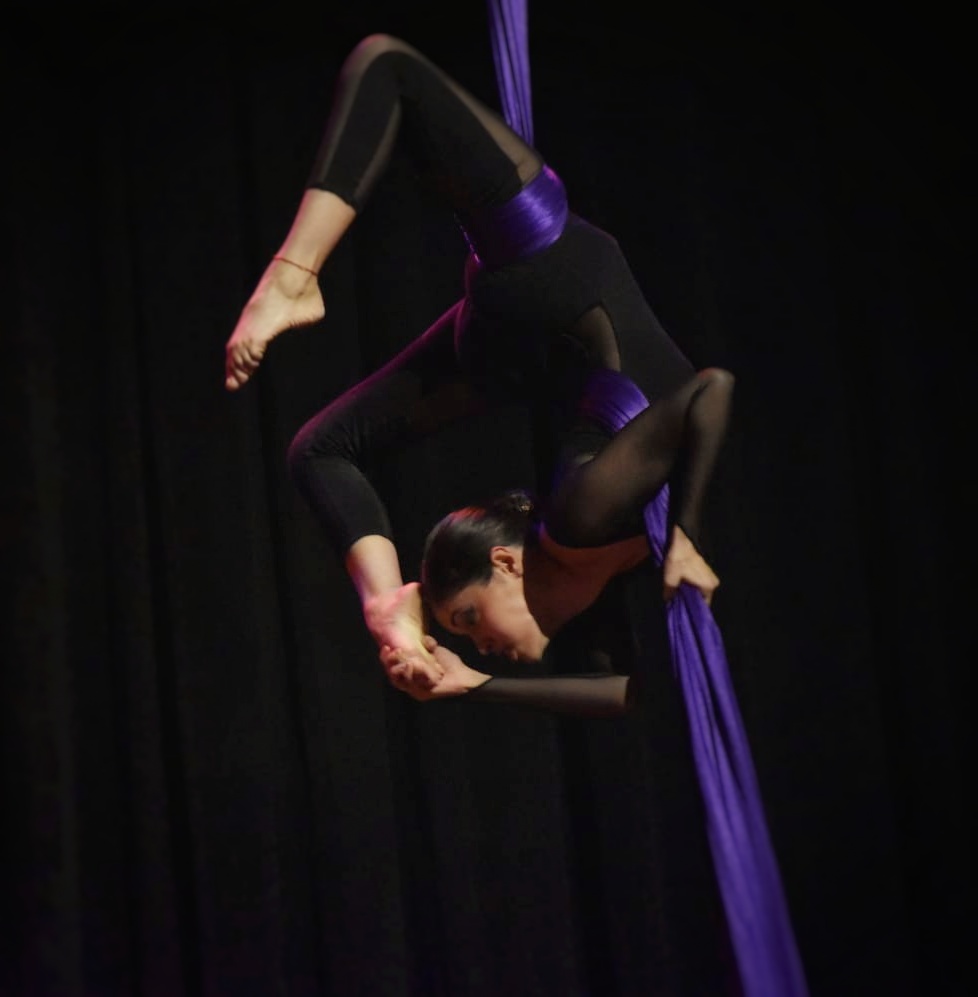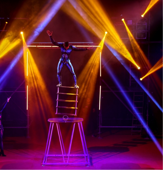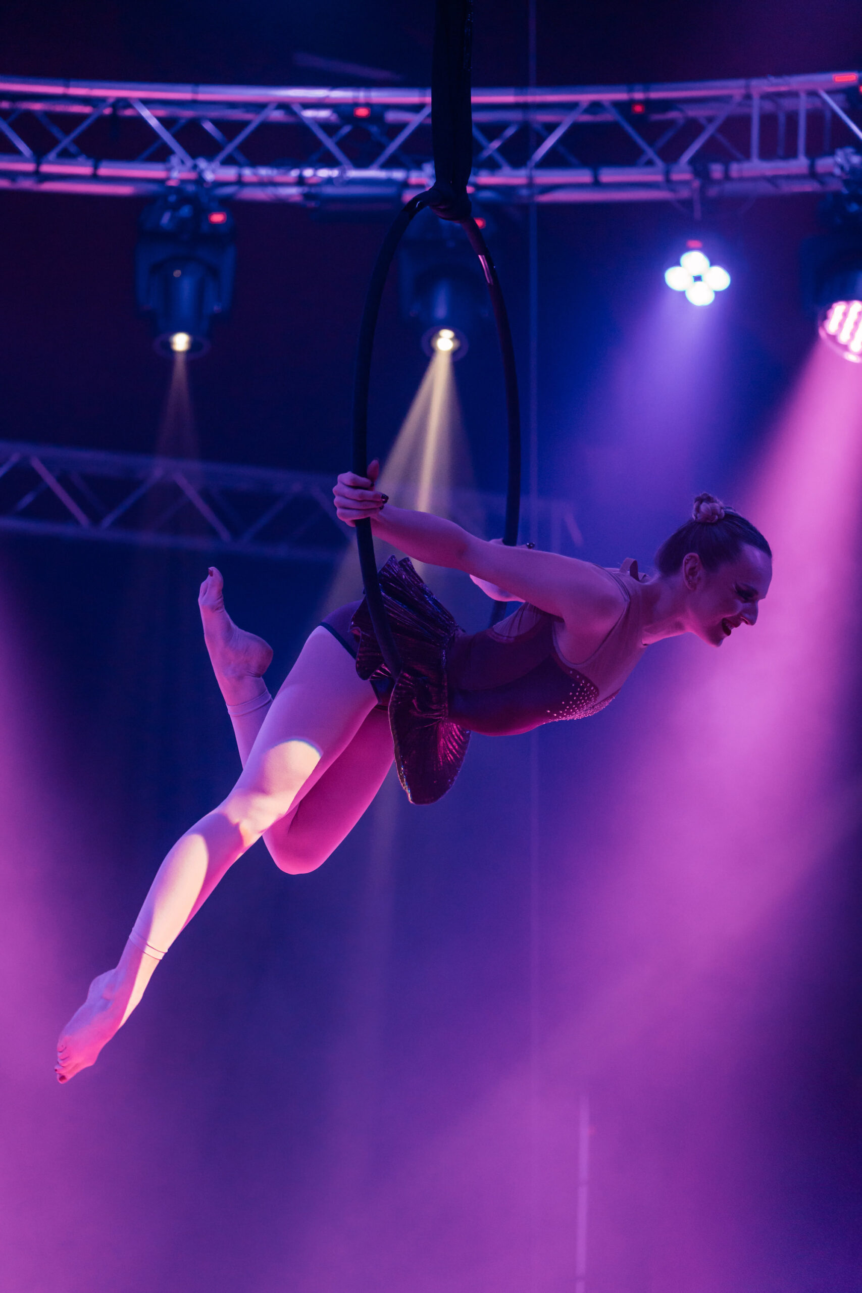 Joué à 360°, au plus près des spectateurs, entrez dans un univers poétique, intense, élégant, où se mêlent danse, humour, chant et prouesses aériennes.